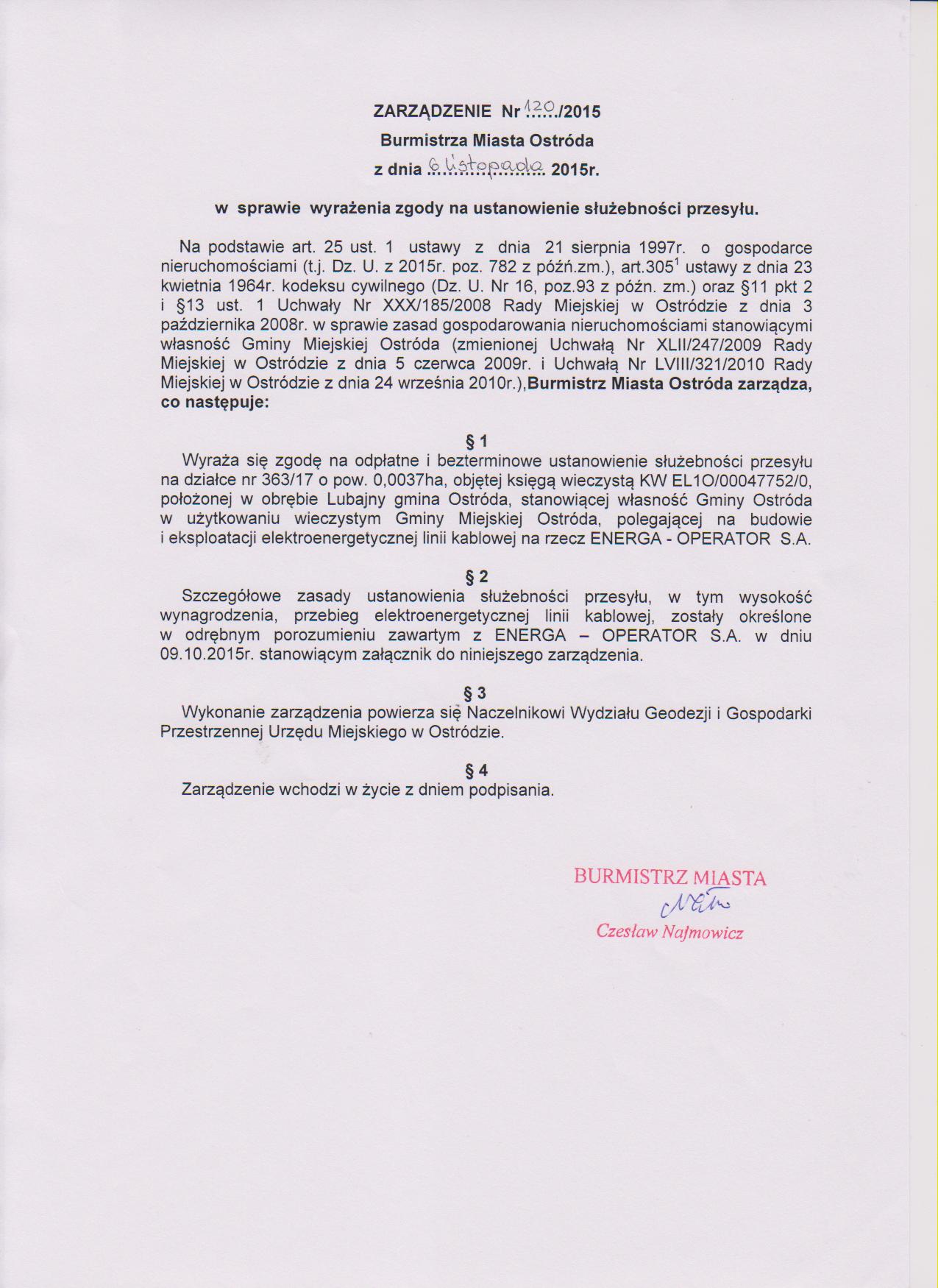 Zarządzenie Nr 120/2015 Burmistrza Miasta Ostróda w sprawie wyrażenia zgody na ustanowienie służebności przesyłu