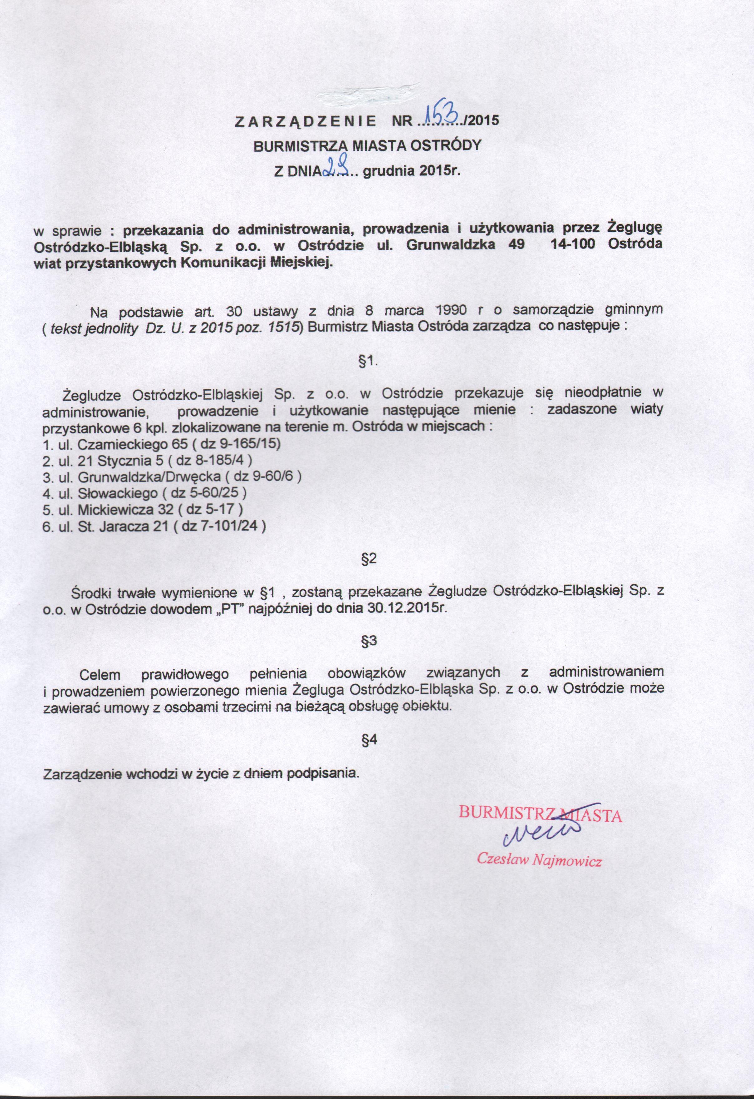 Zarządzenie Nr 153/2015 w sprawie przekazania do administrowania, prowadzenia i użytkowania przez Żeglugę Ostródzko-Elbląską Sp. z o.o. w Ostródzie ul. Grunwaldzka 48 14-100 Ostróda wiat przystankowych Komunikacji Miejskiej
