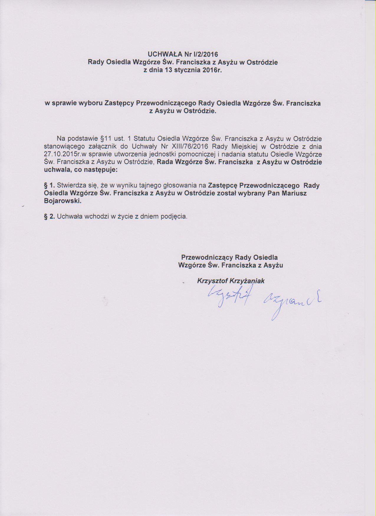 Uchwała Nr I/1/2016 Rady Osiedla Wzgórze Św. Franciszka z Asyżu w Ostródzie z dnia 13.01.2016 r., w sprawie wyboru Przewodniczącego Rady Osiedla Wzgórze Św. Franciszka z Asyżu w Ostródzie