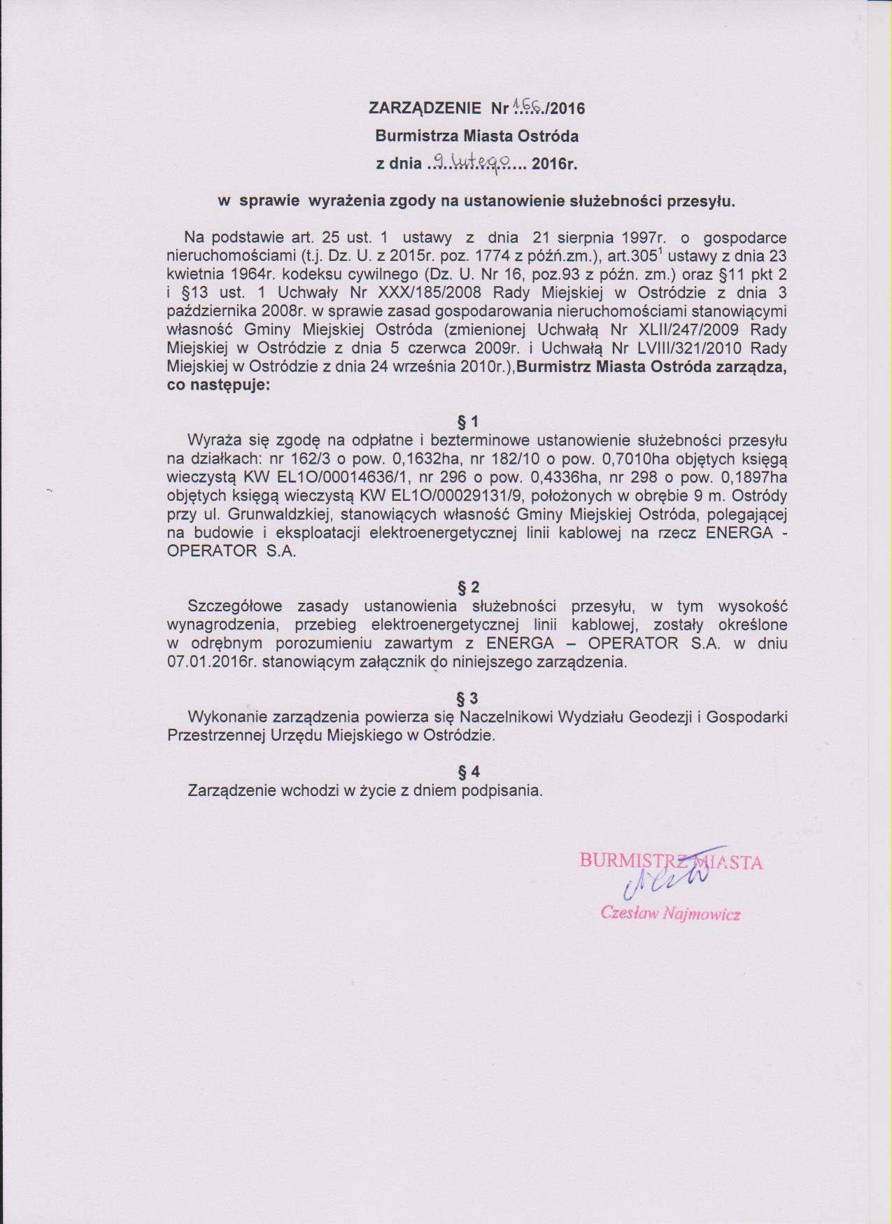 Zarządzenie Nr 166/2016 Burmistrza Miasta Ostróda z dnia 9 lutego 2016 r., w sprawie wyrażenia zgody na ustanowienie służebności przesyłu