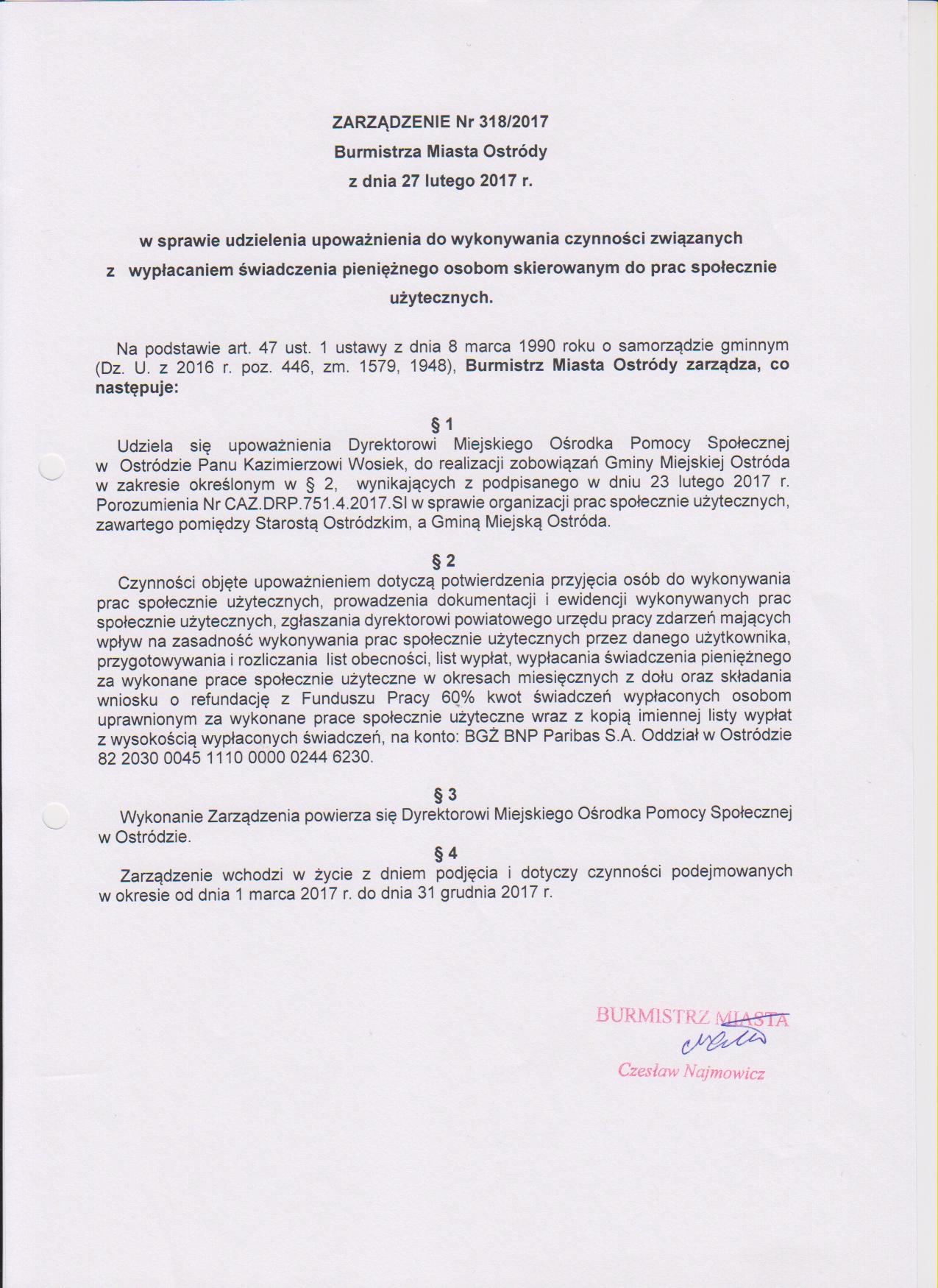 Zarządzenie Nr 318/2017 Burmistrza Miasta Ostródy z dnia 27 lutego 2017 r. w sprawie udzielenia upoważnienia do wykonywania czynności związanych z wypłacaniem świadczenia pieniężnego osobom skierowanym do prac społecznie użytecznych