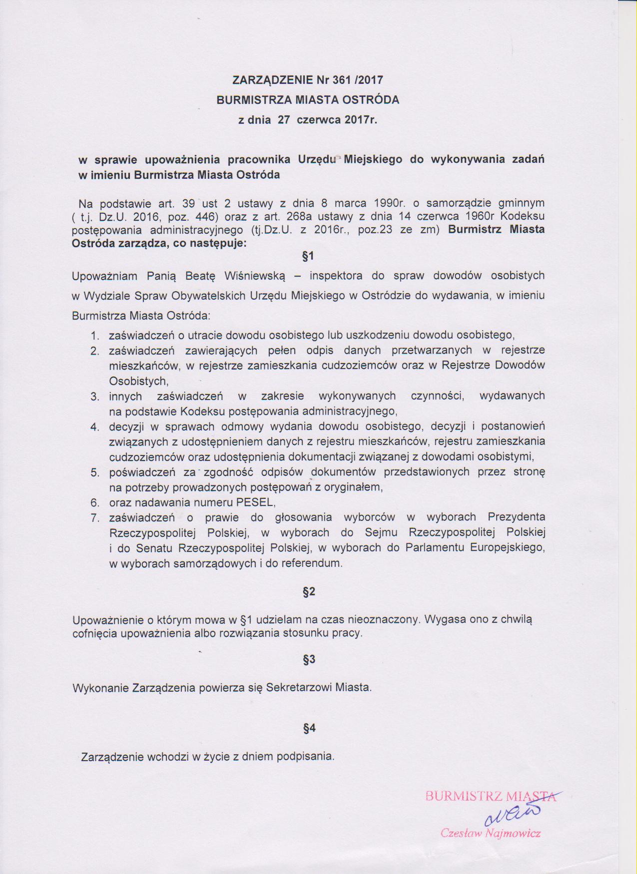 Zarządzenie Nr 361/2017 Burmistrza Miasta Ostróda z dnia 27 czerwca 2017 r. w sprawie upoważnienia pracownika Urzędu Miejskiego do wykonywania zadań w imieniu Burmistrza Miasta Ostróda