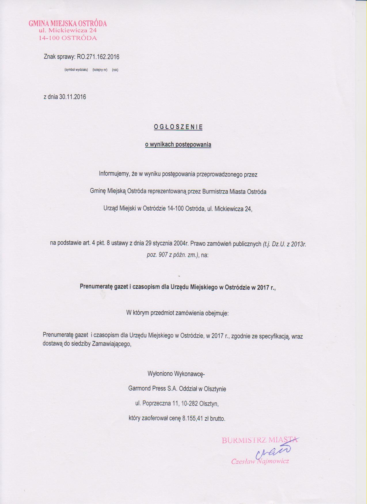 Prenumerata gazet i czasopism dla Urzędu Miejskiego w Ostródzie w 2017 roku